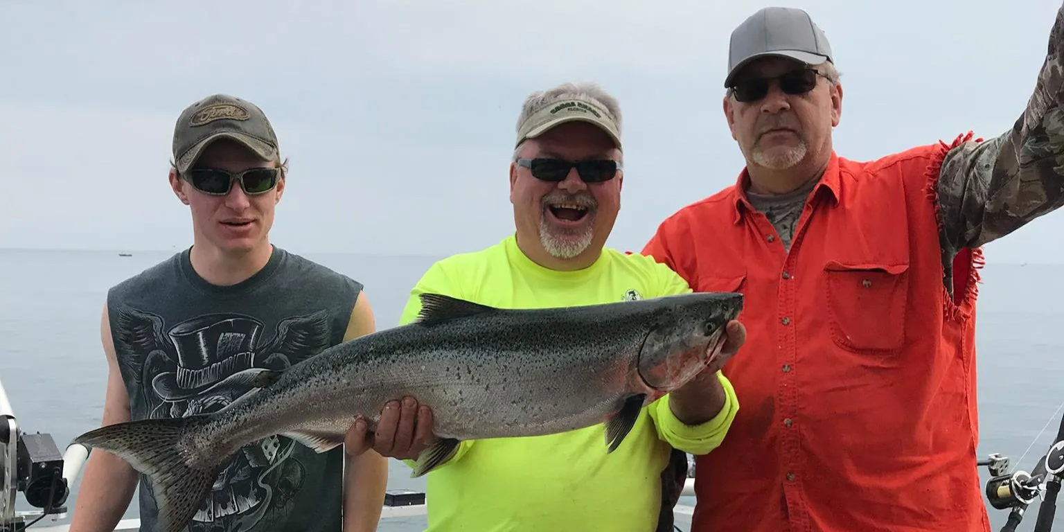 Chinook Salmon: Also called "Kings," these are the heavyweight champs of the Great Lakes. Lake Ontario Chinooks regularly top 20 pounds, with 30+ pounders possible. They hit hard and fight even harder, often requiring multiple runs to the net. Late summer into fall is peak season as mature fish begin their spawning run.